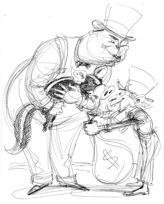 Looking for an image of a pig in a poke led to this preliminary sketch by Victor Juhasz, on his site showing visitors how he makes decisions about directing his delectable line. http://www.drawger.com